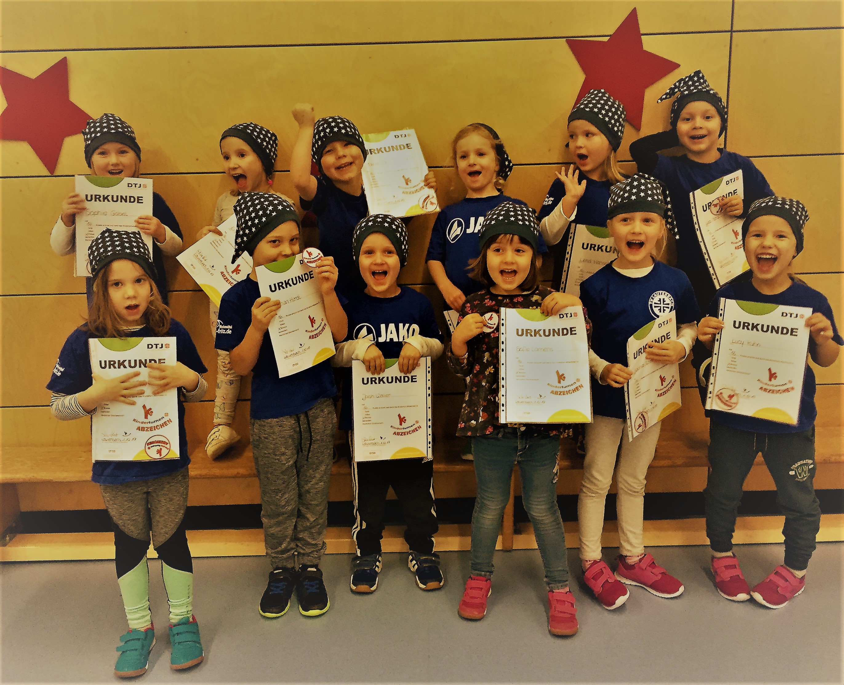 Im vergangenen Jahr haben die jüngsten Sportlerinnen und Sportler eifrig trainiert und wurden am Freitag mit dem Kinderturn-Abzeichen der Deutschen Turnerjugend belohnt. Sie haben alle dafür erforderlichen Aufgaben wie das Schwingen an den Ringen oder Balancieren über eine Wippe erfolgreich als Team gemeistert. Die Verleihung fand im Rahmen der Weihnachtsturnstunde statt, bei der die Kinder als sportliche WEihnachtswichtel alle notwendigen Vorbereitungen für das Weihnachtsfest getroffen haben, sei es den Weihnachtsbaum schmücken oder die letzten Plätzchen backen. Mit großer Begeisterung und Freude nahmen alle Kinder teil und hielten zum Ende der Stunde stolz ihr Kinderturn-Abzeichen in die Höhe.